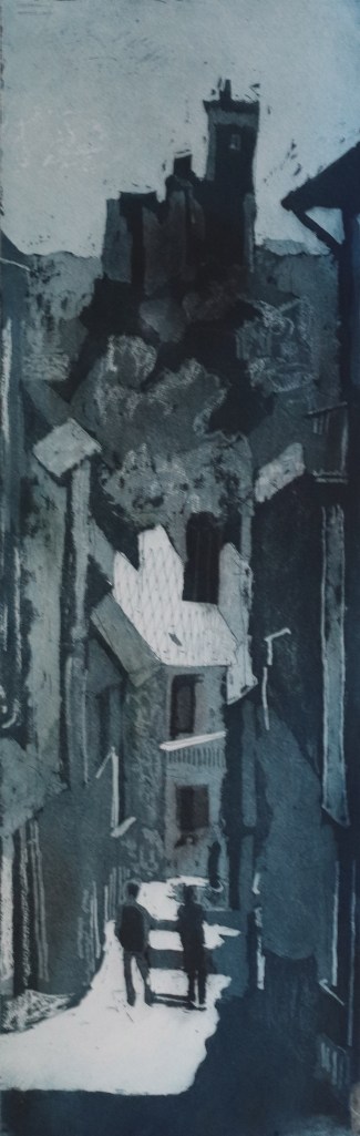 I have become interested in doing etchings in a long thin format. I was initially inspired by seeing a long thin ink drawing of a castle by Victor Hugo. This inspired the first in this series which is a view of the castle above the village of Najac in South West France.