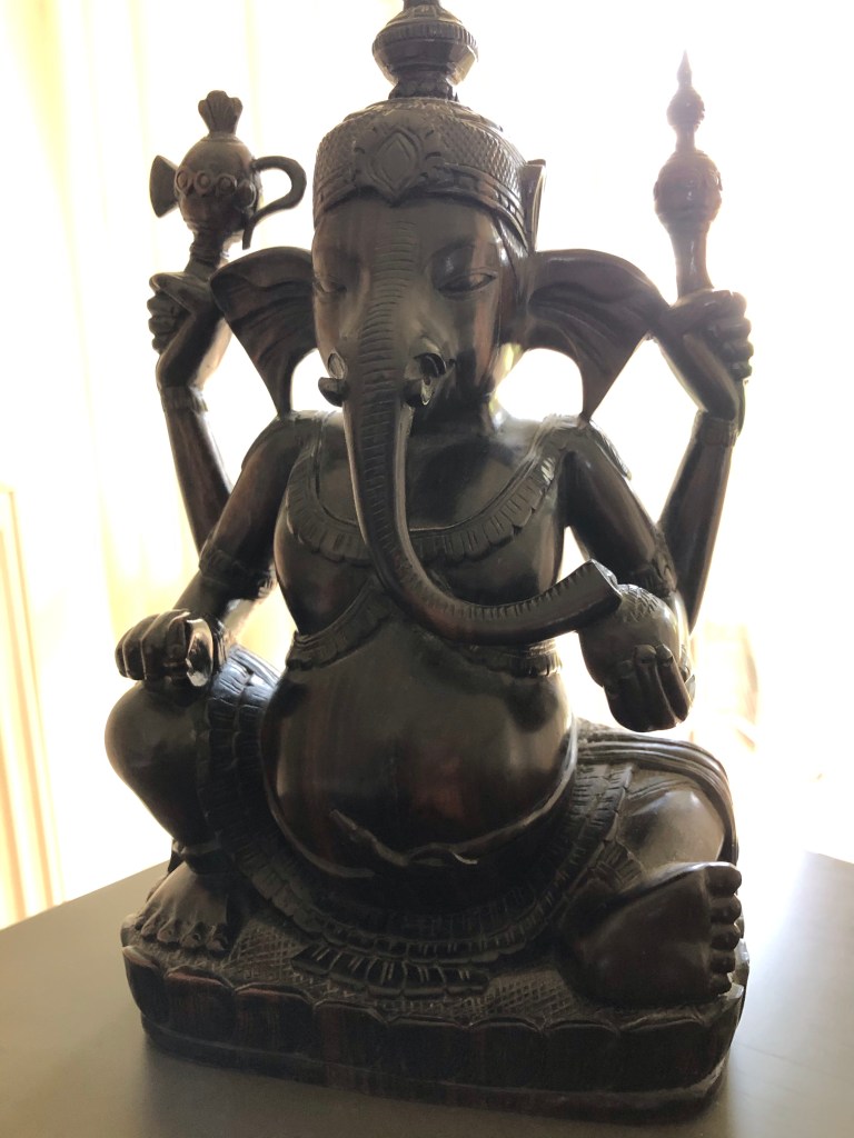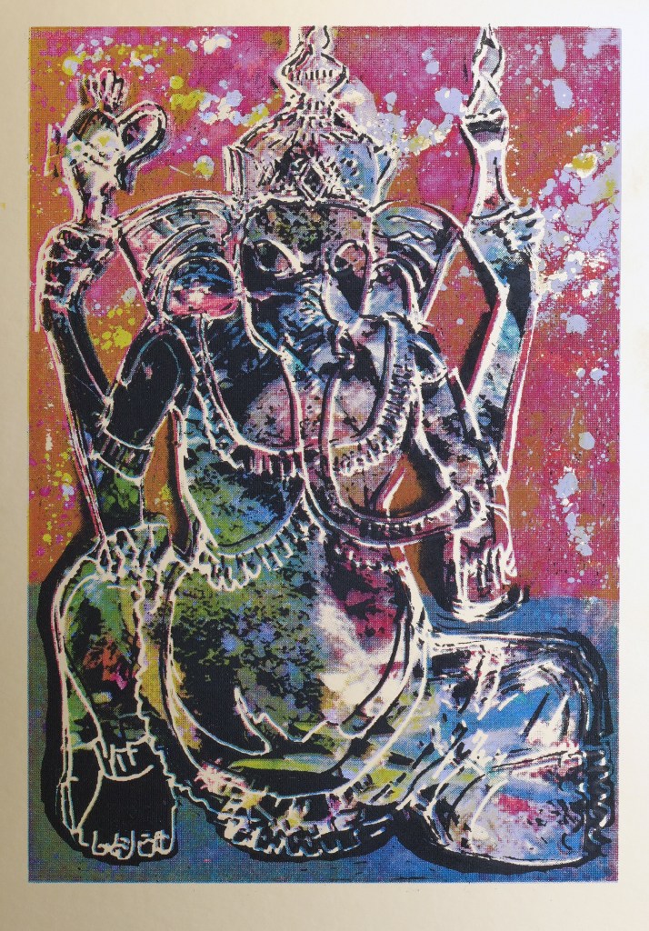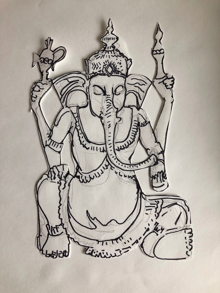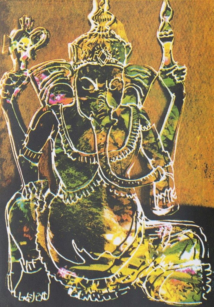 Stuck at home during lockdown I was thinking about objects that meant something to me. I was given a wooden Balinese Ganesha many years ago as a present when I was working in Bali and I am very attached to,him. So the print started with a drawing of the Ganesha.