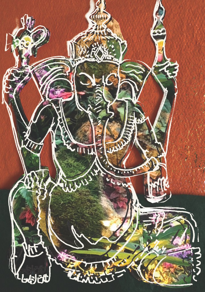 I have been enjoying mixing drawn images with photographic images recently and am particularly pleased with the way two recent images have come out. They are images of the Hindu god, Ganesha, one printed on normal paper and the other on a high quality gold paper.
