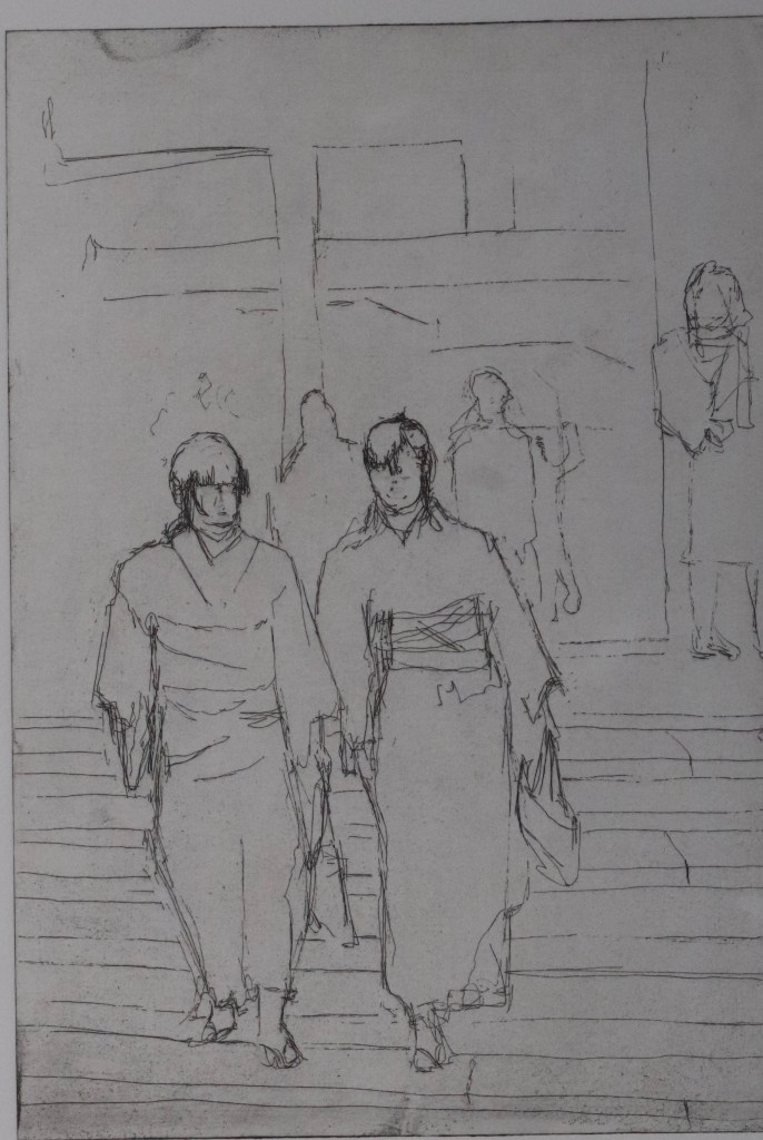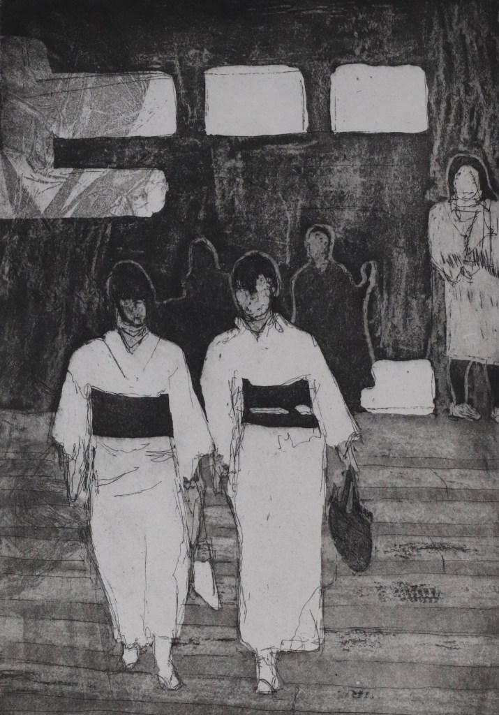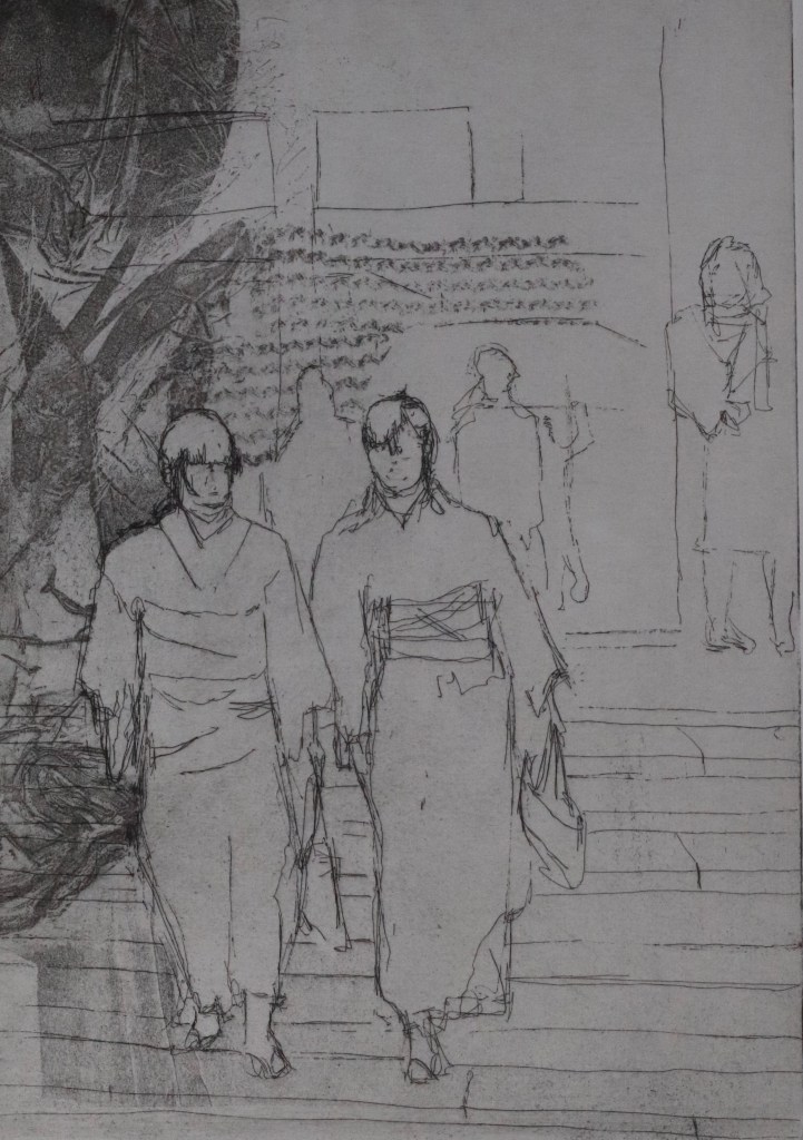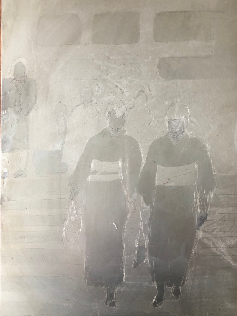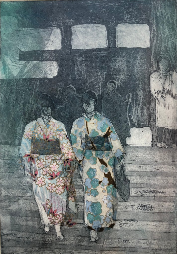 But I still wanted to experiment with the printing. The final print ( at the beginning of the section) uses a variety of coloured inks rubbed into different parts of the plate and a technique called chine-collée on the kimonos. Japanese chiyogami paper was pasted, placed on the kimonos and when the plate went through the press it adheres to the printing paper.