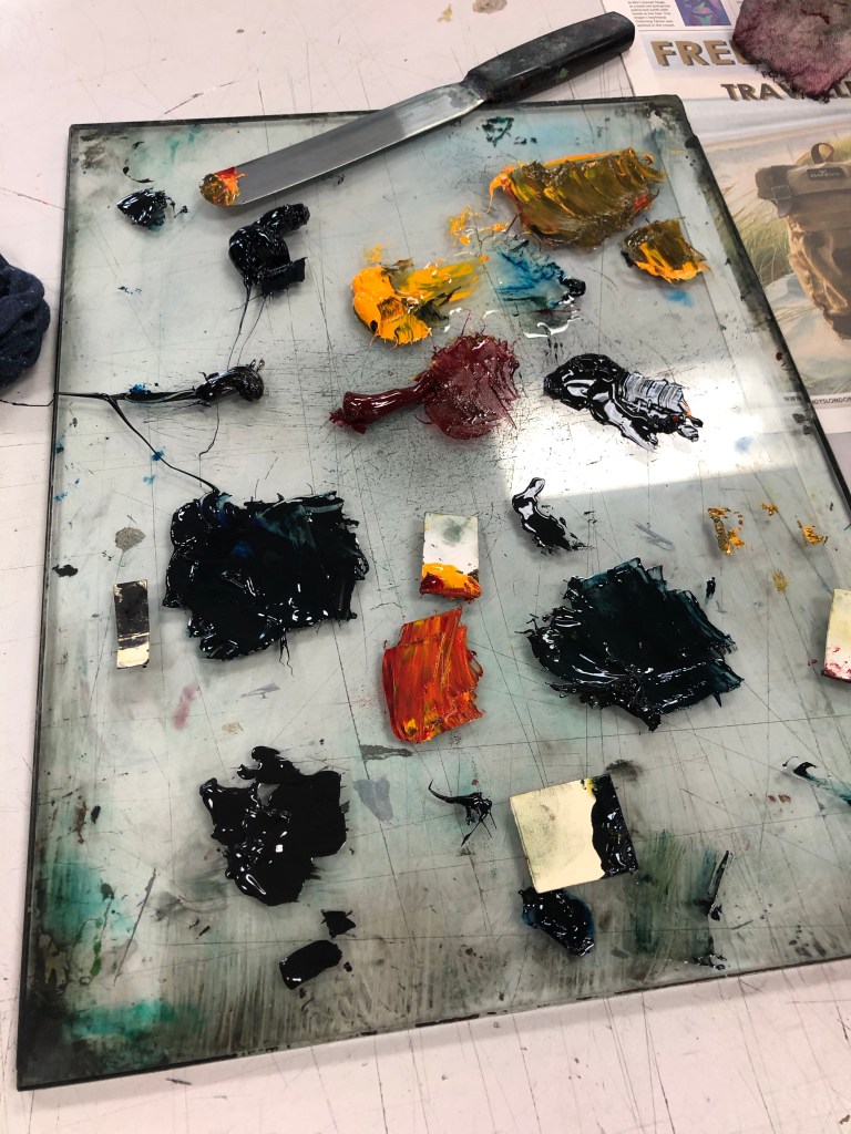 I then added an aquatint. Aquatints allow tone to be added to a print by progressively blocking out areas that you wish to stay lighter. I use various tools to block out which allows more texture to be added. This is the print at this stage.